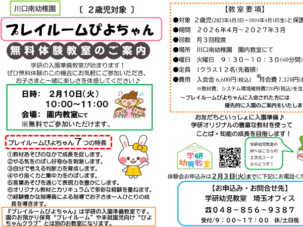 学研のプレイルームぴよちゃん無料体験教室のお知らせ!